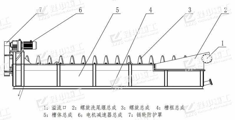 3、螺旋洗砂機具有可調式溢流堰板,確保了細粒產品的穩定性,選洗效率高。