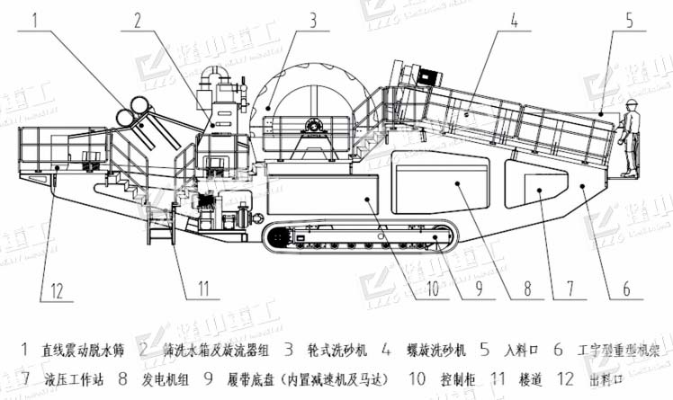 結構組成:履帶式移動洗砂機由篩分裝置、水洗裝置、脫水回收裝置、泵及電機組件、傳送皮帶、電控及液壓系統等組成。