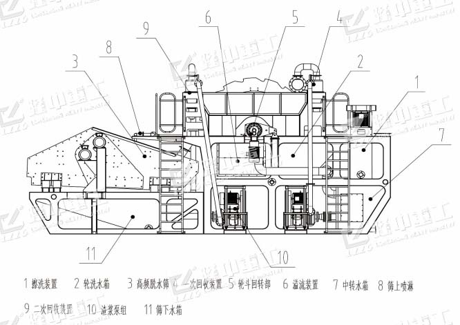 物料先經(jīng)過擦洗機(jī)進(jìn)行擦洗,除去砂顆粒表面附著的泥粉;擦洗后的物料進(jìn)入輪洗洗砂機(jī)進(jìn)行二次清洗;擦洗機(jī)和輪式洗砂機(jī)溢流水進(jìn)入副水箱進(jìn)而進(jìn)入旋流器進(jìn)行細(xì)砂回收,同時將擦洗和洗砂過程中的泥水由旋流器反水口溢流到尾水處理系統(tǒng)。經(jīng)過擦洗機(jī)和輪式洗砂機(jī)清洗后的粗、細(xì)砂進(jìn)入脫水篩進(jìn)行脫水,脫水篩下水箱的水由泵送入旋流器進(jìn)行第二次細(xì)砂回收,同時將泥水由旋流器反水口溢流到尾水處理系統(tǒng)。