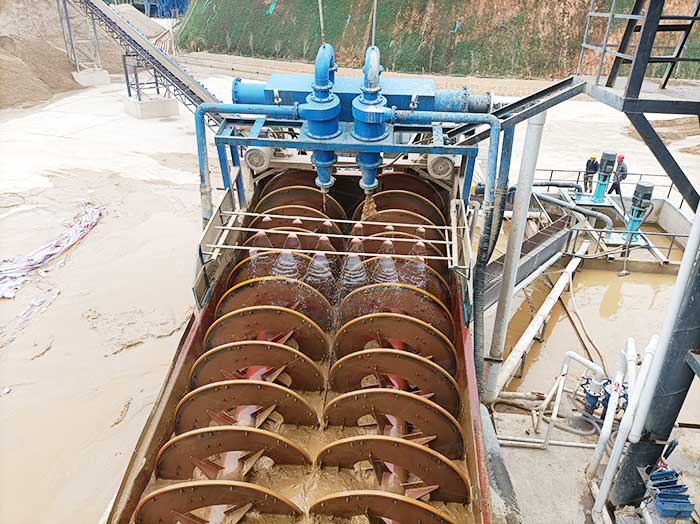 洗砂過程: 螺旋洗砂機一般是傾斜安裝的,工作時在電動機的作用下螺旋開始轉動,砂石從進料槽進入到清洗槽中,在螺旋的帶動下翻轉并相互碰撞研磨,在除去砂石表面的雜質的同時破壞掉包覆砂粒的水汽層以利于脫水,砂石在螺旋的帶動和自身重力的作用下,由高處向低處運動,干凈的砂石從旋轉的進入出料槽,完成清洗。